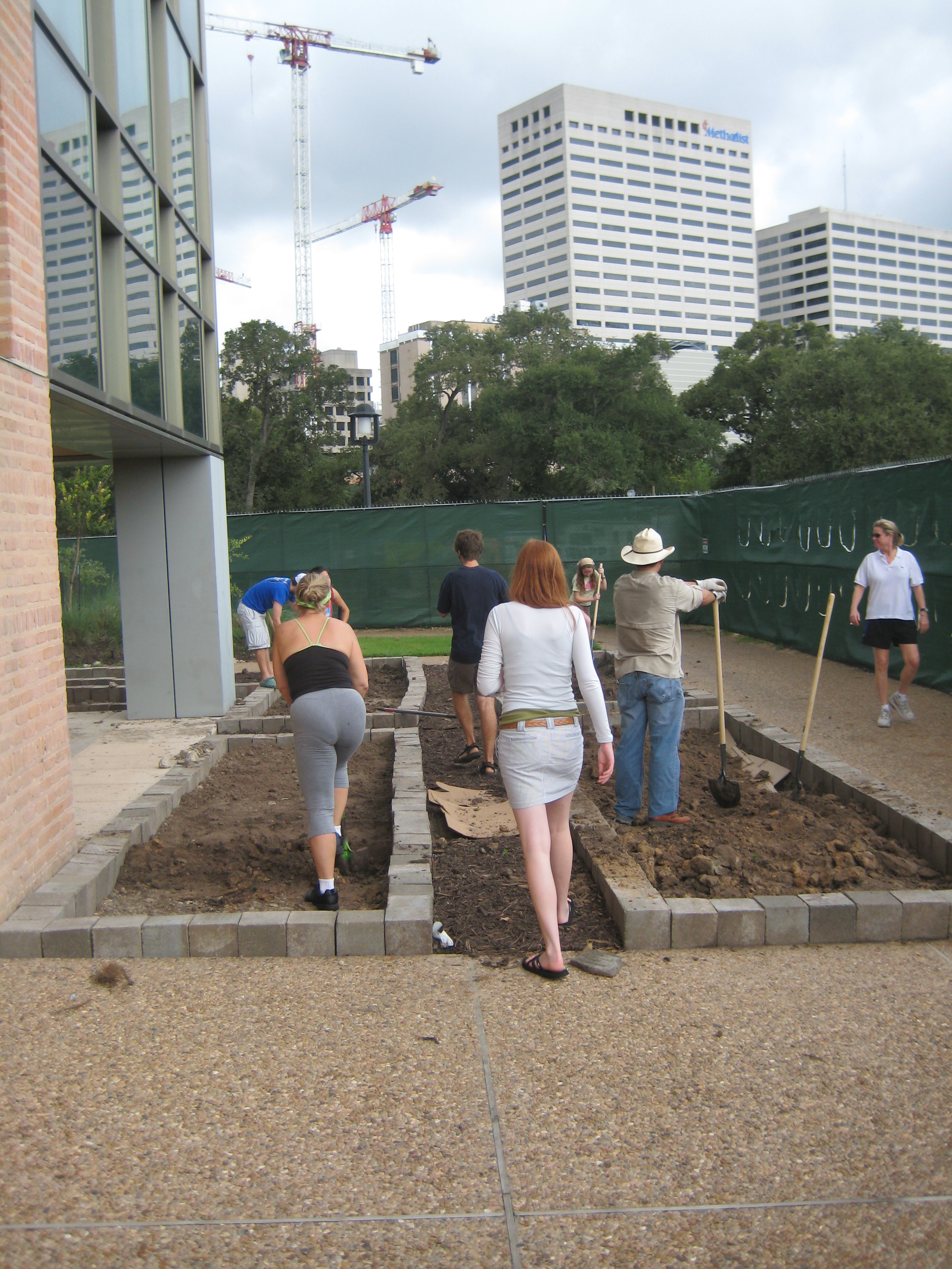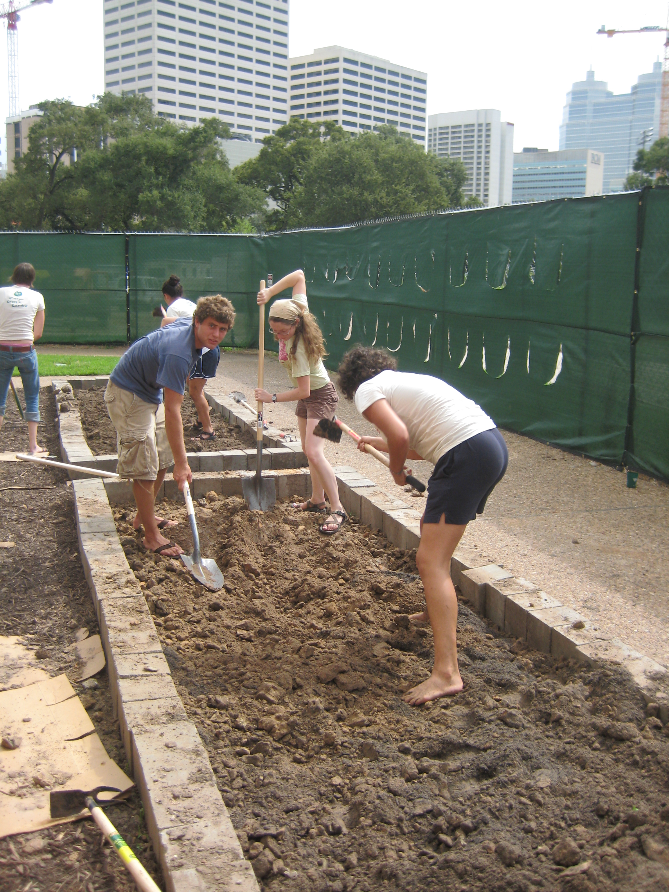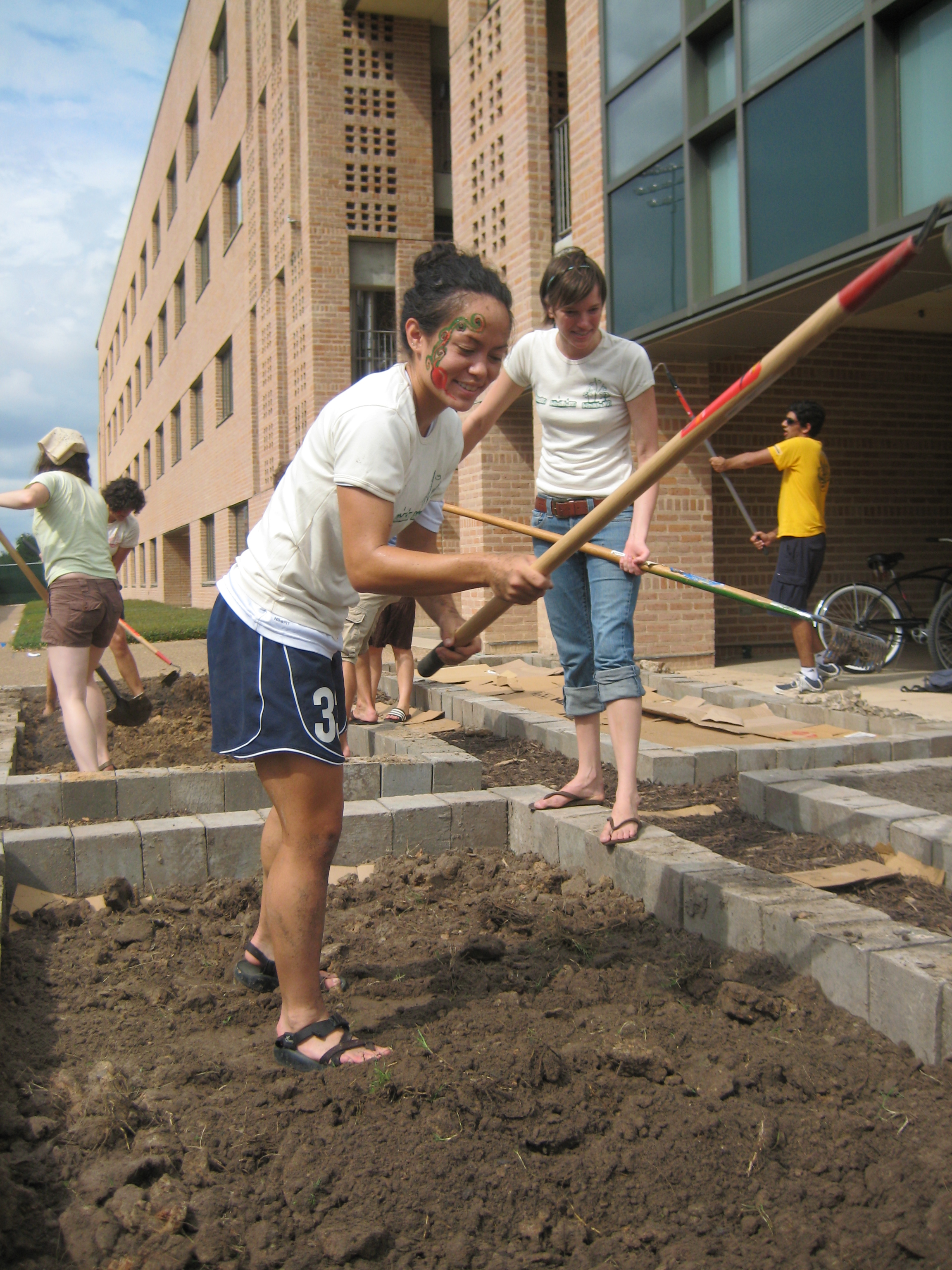 On October 7, 2007, Rice broke ground on its new community garden plot. Participants helped to move soil onto the beds and enjoyed free snacks (including organic citrus aid made from Rice's own trees), facepainting, music provided by KTRU, and a trampoline.