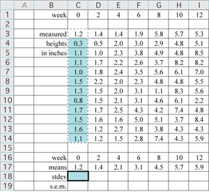 You can also enter formulas by typing them in, starting with the = sign. Now we need to divide the standard deviation by the square root of N, the number of data points in each set. You know that you have 12 data points in each sample, so in this example you can simply enter into cell C19 the formula "=STDEV(C3:C11)/SQRT(12)". Copy the cell and paste into the adjacent cells to complete the s.e.m. calculation for each data set. You could also type the = sign and select cell C18, then complete the formula to read, "=C18/SQRT(12)". If you have large data sets you might use the COUNTA( ) function to obtain N. COUNTA( ) returns the number of cells with data in them. The formula "=C18/SQRT(COUNTA(C3:C14))" gives you the same result.