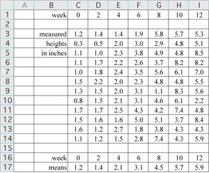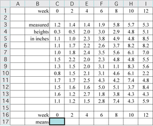 Thank goodness for spreadsheets. To follow along in Excel you might copy the data and paste into a new worksheet with cell B1 selected. To eventually plot the data we want the plotted variables to be adjacent, either in columns or in rows as we have it here. Copy row 1 headed by "week," and paste it into row 16.