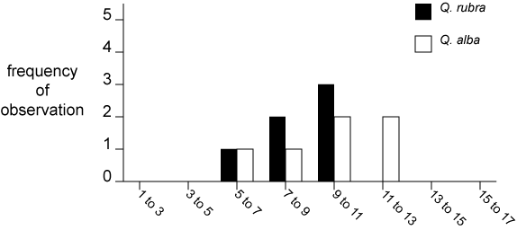 | Quercus alba | 11-13 | 9-11 | 5-7 | 9-11 | 11-13 | 7-9 | 7-9 | 7-9 | 5-7 | 7-9 | 7-9 | 5-7 |