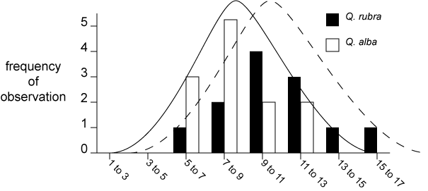 Notice that there is a difference in the postions of the two peaks, but there is a lot of overlap among the data points and between the two distribution curves. Does this overlap mean that there is probably no significant difference in growth rate between the two species? To make that decision we have to consider some facts about normal distributions.