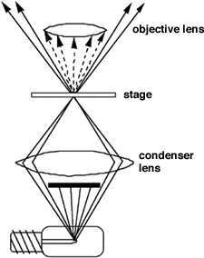 Dark Field ViewingDark field optics are a low cost alternative to phase contrast optics. The contrast and resolution obtained with inexpensive dark field equipment may be superior to what you have with student grade phase contrast equipment. It is surprising that few manufacturers and vendors promote the use of dark field optics. A dilute suspension of yeast cells makes a good practice specimen for dark field optics, particularly when cultured with living Paramecium. PrincipleTo view a specimen in dark field, an opaque disc is placed underneath the condenser lens, so that only light that is scattered by objects on the slide can reach the eye (figure 2). Instead of coming up through the specimen, the light is reflected by particles on the slide. Everything is visible regardless of color, usually bright white against a dark background. Pigmented objects are often seen in "false colors," that is, the reflected light is of a color different than the color of the object. Better resolution can be obtained using dark field as opposed to bright field viewing.