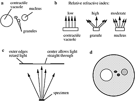 Figure. (a) organelles are nearly invisible in bright field although they have different refractive indexes; (b) light is bent and retarded more by objects with a high refractive index; (c) in phase contrast a phase plate is placed in the light path. Barely refracted light passes through the center of the plate and is not retarded. Highly refracted light passes through the plate farther from center and is held back another one quarter wavelength.; (d) The microscope field shows a darker background (in this case the cell cytoplasm has a higher refractive index than the contractile vacuole), with the organelles in sharp contrast. Using phase contrastPhase contrast condensers and objective lenses add considerable cost to a microscope, and so phase contrast is often not used in teaching labs except perhaps in classes in the health professions and in some university undergraduate programs. This is unfortunate since the images obtainable in phase contrast mode can be very dramatic. To use phase contrast the light path must be aligned. An element in the condenser is aligned with an element in a specialized phase contrast lens. This usually involves sliding a component into the light path or rotating a condenser turret. The elements are either lined up in a fixed position or are adjusted by the observer until the phase effect is optimized. Generally, more light is needed for phase contrast than for corresponding bright field viewing, since the technique is based on a diminishment of brightness of most objects. |