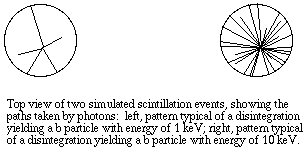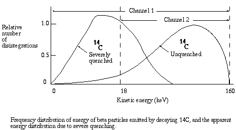 Now here is how the detection system works. The vial is lowered into a dark chamber with photoelectric detectors on each side. Each "flash" received by the detectors corresponds to one atomic disintegration. The detectors are connected, via photomultiplier tubes, to a microprocessor unit that records not only each event, but also the number of photons detected during each event (brightness of the flash). At brief intervals, such as 1/100 second, the instrument calculates the number of flashes per unit time, displaying them as counts per minute, or CPM. Background and QuenchingNo detection system perfect, of course. In liquid scintillation counting, cosmic rays, beta particles from decaying potassium in the glass vial, spontaneous discharges from the very sensitive photodetectors, and chemicals dissolved in the scintillation fluid all can contribute to spontaneous flashes of light that are recorded as counts. The CPM attributable to such sources are called background. Background counts are often so low relative to the activity being measured that they are ignored. However if the number of "real" counts is low, background counts can contribute to experimental error. It is a good practice to include a vial containing everything except added radioactivity as a control to determine the background level. Background CPM are then subtracted directly from the CPM for the experimental samples.Unfortunately, there are two more little problems. No instrument is capable of recording all of the atomic disintegrations within a scintillation vial. Because of the geometry of the vial and photoelectric detectors some events go undetected. The maximum efficiency with which a low energy emitter such as tritium can be detected is about 70%. Worse yet, the energy of some photons is absorbed by chemicals in the solvent before the photon can reach the detector. The latter phenomenon is known as quenching. With the chemical quenching that is typical of most experiments, the usual counting efficiency for tritium is 30 to 40%, and sometimes much less. The amount of quenching can vary from sample to sample, therefore it is often necessary to estimate the efficiency of counting for each individual sample. Remember that the amount of light detected is proportional to the energy of the beta particle that was released by the disintegrating nucleus. When you prepare to count samples, you select appropriate "windows", that is, ranges of light intensity that the instrument will record as counts. The instrument records the amount of light detected following an event, and if that amount is within the energy range for a particular window, the event is recorded as one count. It is ignored if it falls outside the selected range. Each window is given a channel number, and the count for each window is given as CPM for the corresponding channel.