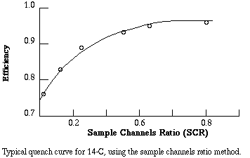 As quenching takes place, the energy recorded for each event is less than it would be for an unquenched sample, since for each event the energy of some photons is absorbed before detection is possible. The energy spectrum is shifted to the left, and the greater the quenching the greater the shift. As the shift takes place, the ratio of counts in channel 2 to counts in channel 1 becomes smaller. That ratio is known as the sample channels ratio, or SCR. Counting efficiency is positively related to the SCR. To get a conversion factor between SCR and efficiency, equal known amounts of the isotope are added to a series of vials. Progressively greater amounts of a quenching agent, such as carbon tetrachloride, are added to each vial. The vials are counted and CPM is divided by known DPM to get the fractional efficiency of counting. For example, if a vial with 20,000 DPM of tritium yields 5,000 CPM, the fractional efficiency of counting was 5,000/20,000 = 0.25, that is, 25% of the atomic disintegrations were detected. Fractional efficiency is plotted versus SCR to yield a quench curve. The instrument prints out CPM and SCR for each sample, therefore to get actual DPM in a sample the investigator must (1) subtract background CPM from the CPM for the sample, (2) determine fractional efficiency from the SCR for the sample, and (3) divide net CPM by the fractional efficiency.