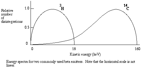 Detection and Measurement of RadioactivityRadioactive DecayIsotopes of a given element have nuclei with the same number of protons but different numbers of neutrons. Some isotopes are stable, however radioisotopes are unstable and disintegrate, with the emission of three main types of radiation.Alpha emitters release a particle composed of 2 neutrons and 2 protons. The atomic number is therefore reduced by 2, and the atomic mass by 4. Alpha particles are so heavy that even with low velocity their momentum is high. They don't travel far, but when they collide with other molecules they do a lot of damage, therefore alpha emitters are considered to be quite hazardous. When a beta particle emitter decays, one of its extra neutrons is converted to a proton, increasing its atomic number by 1 without changing its atomic mass. The breakdown is accompanied by the emission of a negatively charged particle of low mass, called the beta particle, and an uncharged particle of low mass, called a neutrino. For example, hydrogen consists of just one proton and one electron. Deuterium (2-H), a component of "heavy water," consists of a proton, an electron, and one neutron, and is a stable isotope. Tritium (3-H) is an unstable isotope of hydrogen, consisting of a proton, an electron, and two neutrons. When an atom of tritium decays, one of the neutrons is converted to a proton, one beta particle and one neutrino are released, and a helium isotope (3-He) remains. Tritium is called a "soft" beta emitter, because its beta particles have relatively low velocities. A hard beta emitter such as 32-P (phosphorous) is more dangerous because its beta particles carry more kinetic energy (however it is easier to detect - read on). Gamma rays consist of electromagnetic radiation resembling X-rays. An example of a gamma emitter is 131-I (iodine). Gamma radiation may accompany either alpha or beta particle emission. A traditional unit of radioactivity is the Curie (Ci), which is defined as that quantity of any radioisotope undergoing 2.22 x 10^12 atomic disintegrations per minute (DPM). A milliCurie (mCi) of a radioisotope undergoes 2.22 x 109 DPM, and a microCurie produces 2.22 x 10^6 DPM. Since 1975, the becquerel (Bq) has replaced the Curie as the preferred international unit of radioactivity. One Bq is defined as one atomic disintegration per second, or 2.703 x 10^-11 dpm. Working amounts in a laboratory might be described in microCuries or milliCuries, kiloBecqerels or megaBecquerels. When the product of an atomic disintegration is a stable isotope, atomic decay leaves less radioactive material behind. Therefore, as time passes, the amount of activity declines logarithmically. The half-life of a radioisotope is the time it takes for one-half of the unstable atoms to disintegrate. Each radioisotope has a characteristic rate of decay and pattern of radiation. For example, 14-C is a low energy beta emitter with a half life of 5500 years. A radioisotope, or any compound that contains a radioisotope, is said to be radiolabeled and is called a radionuclide. The specific activity of a radionuclide is the amount of radioactivity, Bq or Ci, per mole of the compound. Clearly, as radioactive decay proceeds, the specific activity of any radionuclide declines. Methods of detectionThe method employed to detect radiation depends on the type of emitter and the intended purpose of detection. The most well known method of detecting radiation is with an ionization chamber. A high energy particle can dislodge electrons from the atoms it strikes, producing pairs of ions. Particles are allowed to pass between parallel plates, one with a positive charge and one with a negative charge. As ionization takes place the ions each move to the plate with the opposite charge, producing a current. The current is read on a meter. The Geiger-Mueller counter is based on the ionization detection principle.Photographic film can be exposed by all types of radiation, and is used to monitor exposure of personnel working with high energy emitters. A visible track in a cloud or bubble chamber can pick up radioactivity, as can a calorimeter if the energy emitted is quite high. A problem with many methods of detection is that the energy of the emitter must be high enough to travel some distance through air. The particles emitted by many radionuclides, especially 14-C and 3-H labeled compounds, do not travel a significant distance in air, but pose a danger if internalized because of their proximity to molecules such as DNA. For example, a beta particle emitted by tritium cannot penetrate a sheet of paper, yet tritium in the body fluids can pose a significant hazard. A liquid scintillation detector can pick up radiation from "soft" beta emitters as well as from other radioisotopes. An ionizing particle is allowed to pass through a crystal or liquid phosphor, which absorbs its energy and re-emits the energy as flashes of light. Usually the emitter must be dissolved in liquid containing the luminescent compound, so that the distance traveled by the particle is very short. Liquid scintillation countingThe amount of kinetic energy in a beta particle differs from one decay to the next. However, each radioisotope has a typical energy spectrum, that is, a predictable range of energies. Typical energy spectra for different radioisotopes can be radically different in shape and magnitude, as with the commonly used 14-C and 3-H.