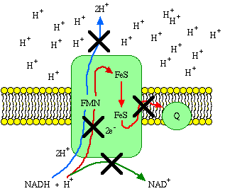 Just for the sake of understanding the principles, let Complex I (NADH dehydrogenase complex), embedded in an intact inner membrane, be the only component of an experimental electron transport system. We'll simply take the electrons from Coenzyme Q when they reach it, so the system can keep going. The removal of protons from the matrix and deposition of protons in the intermembrane space creates a concentration difference of protons across the inner membrane. This is called the chemiosmotic gradient. As the gradient builds up, more and more energy is required to push protons across. When the amount of energy required to push protons reaches 69.5 kJ/mole, electron transport has to stop. In fact, the second law of thermodynamics requires that electron transport stop before the gradient builds up to that point.