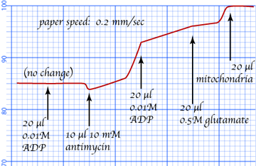 We used a different substrate this time. Compare glutamate-stimulated respiration to succinate-stimulated respiration. Notice that antimycin produced the same effect as "reagent x," earlier. Notice also that in the presence of antimycin, adding ADP produces no change in oxygen consumption. Why?