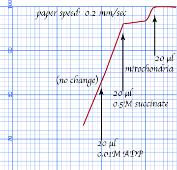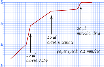This trace shows what happens when we add a limited amount of ADP to mitochondria in the presence of a substrate. For the paper you will need to calculate the amount (in micromoles) of ADP added. You will also need to calculate the amount of oxygen that was consumed during ADP-stimulated respiration, in order to determine an ADP:O ratio.