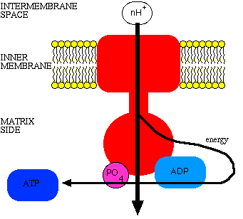 Embedded in the inner membrane among the structures of the electron transport system are structures called the ATP synthase complex. The complex consists of a proton channel and catalytic sites for the synthesis of ATP from ADP and phosphate. When ADP and phosphate are available, they bind the catalytic sites on the ATP synthase. When this happens, the channel opens, and protons can come whooshing back in. The energy released is used to couple the phosphate to ADP, to make ATP.