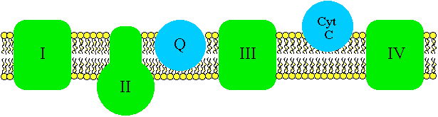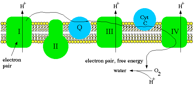 Electrons cannot be passed through unless the protons are translocated at the same time. The energy used to force the protons across the inner membrane is released by the passage of the electron pair from NADH to coenzyme Q. The electrons are then passed through complex III, where more protons are forced across, and complex IV, where still more protons are forced across. Complex IV, called cytochrome oxidase, uses the energy it receives along with an electron pair to reduce oxygen to water. Note that since molecular oxygen is diatomic it takes two cytochrome oxidase complexes, two electron pairs, and four hydrogen ions to complete the reaction.