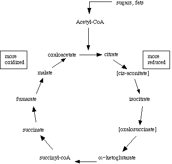 At certain points in the cycle, carbon dioxide is lopped off, so the number of carbon atoms from citrate to oxaloacetate is reduced from 6 to 4. Hydrogens are removed when water molecules are taken off of the substrates. So the system is in balance. But what happens to the free energy that is being released by progressive oxidation of substrates?
