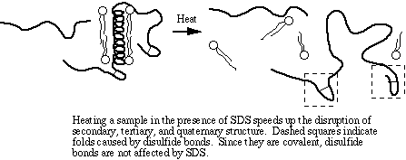 Preparing Protein Samples for ElectrophoresisA polypeptide is a macromolecule consisting of a nonbranching sequence of amino acids, each connected to the next by a single peptide bond. A protein consists of one or more polypeptides and/or additonal types of molecules, held together by any of a number of molecular interactions often including covalent bonds. Such interactions result in several levels of organization, which we call primary, secondary, tertiary, and quaternary structures. Intact proteins are notoriously difficult to separate reproducibly. Patterns of bands vary depending on temperature, buffer, variations in pH, quality of a preparation, etc. To characterize a type of preparation and obtain predictable results we try to take proteins apart so that what we have left is primary structure only. Sample preparation sometimes falls short of that ideal, which you will discover as you analyze your results. The amino acid sequence of a polypeptide is called its primary structure. Interaction of soluble proteins with water leads to hydrogen bonding, which is partially responsible for the secondary structure of proteins. Secondary structure refers to the local structure of a polypeptide chain, including helices, pleated sheets, and turns. A functional protein has a three dimensional stucture resulting from hydrogen bonding, hydrophobic amino acids, Van der Waal's forces, and disulfide bonding. Three dimensional structure of a protein is called its tertiary structure. Quaternary structure refers to the interaction of individual polypeptide chains with other molecules to form functional proteins. Although some proteins do consist of single polypeptides, many consist of two or more polypeptides linked by covalent bonds and/or noncovalent forces. In fact, many native (functional) proteins include nonprotein components such as the heme group of hemoglobin and the carbohydrate groups on many membrane-associated proteins. Sample denaturationVarious sample buffers have been used for SDS-PAGE but all use the same principles to denature samples. We obtain good denaturation by preparing a sample to a final concentration of 2 mg/ml protein with 1% SDS, 10% glycerol, 10 mM Tris-Cl, pH 6.8, 1 mM ethylene diamine tetraacetic acid (EDTA), a reducing agent such as dithiothreitol (DTT) or 2-mercaptoethanol, and a pinch of bromophenol blue to serve as a tracking dye (~0.05 mg/ml). We prepare a 2x concentrate of sample buffer consisting of 2% SDS, 20% glycerol, 20 mM Tris-Cl, pH 6.8, 2 mM ethylene diamine tetraacetic acid (EDTA), 160 mM dithiothreitol (DTT), and 0.1 mg/ml bromphenol blue dye. I prefer DTT to 2-mercaptoethanol because the latter has a much stronger unpleasant odor and it doesn't denature our blood fractions very well. Part of the problem is that our water baths don't reach the boiling point, and boiling may be necessary with 2-mercaptoethanol. We prepare all of our unknowns to the same concentration then mix 1 volume prepared sample to 1 volume 2x buffer. So, what do the various components do? EDTA is a preservative that chelates divalent cations, which reduces the activity of proteolytic enzymes that require calcium and magnesium ions as cofactors. The tris acts as a buffer, which is very important since the stacking process in discontinuous electrophoresis requires a specific pH. Glycerol makes the sample more dense than the sample buffer, so the sample will remain in the bottom of a well rather than float out. The dye allows the investigator to track the progress of the electrophoresis. SDS, DTT, and heat are responsible for the actual denaturation of the sample. SDS breaks up the two- and three-dimensional structure of the proteins by adding negative charge to the amino acids. Since like charges repel, the proteins are more-or-less straightened out, immediately rendering them functionless. Some quaternary structure may remain due to disulfide bonding (covalent) and due to covalent and noncovalent linkages to other types molecules. By the way, another name for SDS is lauryl sulfate. Your shampoo may contain lauryl sulfate - now doesn't that inspire confidence in the product?