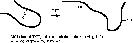 The amino acid cysteine contains a sulfhydryl (-SH) group that spontaneously forms a disulfide bond (-S-S-) with another sulfhydryl group under normal intracellular conditions. Disulfide bonding is covalent and is not disrupted by SDS. DTT is a strong reducing agent. Its specific role in sample denaturation is to remove the last bit of tertiary and quaternary structure by reducing disulfide bonds.