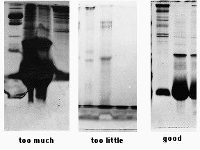 We get the best results if we load 10 µl of a 2 mg/ml final concentration of denatured protein per sample well. While some of the more concentrated proteins will be overloaded, we will detect bands that represent the less common ones. A typical mini-gel well holds 10 µl easily, and perhaps 20 µl or more if the well dividers are in good shape. We will dilute all samples to a predetermined concentration and volume before mixing with the denaturing buffer. Efficient laboratory personnel divide responsibilities, so that while gels are polymerizing they are preparing the samples themselves, to volumes that are at least double the minimum needed to fill the sample wells. Such people start their work prepared with calculations of the volumes of sample, water, and 2x concentrated sample buffer they need in order to prepare each of their samples for electrophoresis. To completely denature the samples we heat them in a steaming water bath for at least 10 minutes. Standards for molecular weight determination are prepared the same way. They are expensive, and although the suppliers give instructions for mixing, it is usually necessary to test them and to make adjustments before relying on them for internal calibration of an important gel. A "dirty" sample (containing a lot of particulate matter) should be centrifuged just before loading. However, samples containing soluble proteins only and samples from a typical blood fractionation are so "clean," that centrifugation is not necessary. Notes on sample preparation