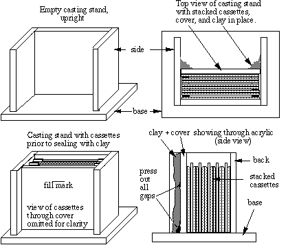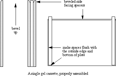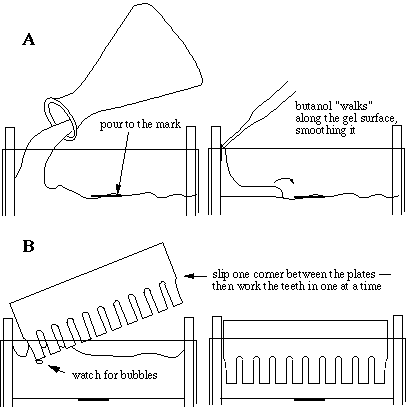 Preparing SDS GelsA gel of given acrylamide concentration separates proteins effectively within a characteristic range. Very large polypeptides cannot penetrate far into a gel and thus their corresponding bands may be too compressed for resolution. Polypeptides below a particluar size are not restricted at all by the gel, and regardless of mass they all move at the same pace along with the tracking dye. Gel concentration (%T) should be selected so that the proteins of interest are resolved. A typical gel of 7% acrylamide composition nicely separates polypeptides with molecular mass between 45 and 200 kDa. Polypeptides below the cutoff of around 45 kDa do not resolve. A denser gel, say 14%T, usually resolves all of the smallest polypeptides in a mix. Such a gel would be needed to resolve hemoglobin, for example. It would be useless for resolving bands much above 60 kDa, though. To analyze the entire profile of a fraction that contains heavy and light polypeptides, one should usually run two gels. In the teaching lab we recommend that alternate teams prepare low or high percent gels, with each team exchanging samples with a team that prepared the other type gel. Each team, then, would load its set of samples, appropriate standards, and another team's samples on its gel, and have its samples loaded onto another percent gel as well. In addition to expanding the range of resolution of bands, this practice allows comparison between identical fractions prepared by different teams, to control for inconsistencies in fractionation, sample preparation, etc. CassettesThere are many systems for setting up gel cassettes, some of which are quite expensive. A simple 'mini-slab' gel system can be put together for a surprisingly little amount of money and does the job quite well. Our teaching program has done well using projector slide cover glasses (Kodak cat. #140 2130) as cassette plates, with casting stand, running stands, combs and spacers supplied by Sam Lee Custom Crafting, P.O. Box 130973, Houston, Texas 77219, tel.#713-861-4636). The procedure described here employs that system.We use casting stands to prepare the mini-slab gels. Two clean plates with two teflon spacers make a single cassette. We stack the cassettes upright in the stand with the bottoms of the cassettes tight to the bottom of the stand, using modeling clay to seal a thick acrylic cover in place against the last cassette to make a water-tight chamber. Using a well-former (comb) as a template, we mark a fill line about a centimeter below the bottom of the comb for the height of the first (separating) gel solution.