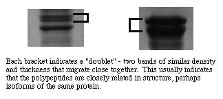 This method does have limitations. For example, identification of a band on a protein gel is not considered positive proof of identity. A great many different polypeptides have very similar molecular masses. One band may mask the presence of more than one polypeptide. Incomplete denaturation, unusual amino acid sequences, and/or presence of non-protein residues can affect mobility, resulting in considerable error estimating molecular mass. We refer to estimates from gels as "apparent molecular mass" for that reason. A unique band may be nothing more than a product of degradation of a heavier polypeptide or an aggregate of two or more lighter ones. OrientationObviously one must have a clear record of how the sample wells were loaded. To maintain left/right orientation one can load the standards to one side of the gel and/or mark the bottom left or right of the gel by taking a piece out just before staining. Bromphenol blue tracking dye diffuses out of acrylamide gels during staining and destaining. If a "dye front" remains it is there because of smaller Coomassie stained polypeptides that were not resolved. When all proteins in a mix are resolved, the original position of the tracking dye is lost following staining/destaining. If measurement of relative mobility is critical, the position of the tracking dye should be marked before staining the gel. Some investigators push a thin wire into the gel edges to mark the dye front. When standards of known molecular mass are run with the unknowns, estimates of molecular mass can be made using some arbitrary reference point such as the bottom of the gel for calculating relative mobility. Critique your gelOverloading, underloading, distortion of lanes, non-reproducible patterns, smears, streaks, etc. can limit the useful information that you can obtain. If such issues prevent you from extracting the information you need, perhaps the "hall of shame" can help you match a cause to your symptoms. Calibrate the gelThe stacking gel is of no use to the analysis and it can be removed. Top of the gel refers to the top of the separating gel, that is, the point at which different polypeptides began to separate. A mix of protein standards usually consists of five to eight individual polypeptides that produce a prominent "ladder." Standards are identified from the top down. Depending on %T one or more of the lowest mass standards may not resolve. To prepare a standard curve for molecular mass one estimates a relative mobility for each standard and plots a standard curve of molecular mass versus relative mobility on semi-log paper or log molecular mass versus relative mobiltiy on conventional graph paper. Relative mobility is determined by measuring the distance from the top of the gel to the middle of the dye front or arbitrary reference point, measuring the distance from the top of the gel to the middle of the band, and dividing the second measurement by the first. This is the Rf, which is always between 0 and 1. Note that the relative mobility of a given protein depends on gel concentration. Any single gel has an upper and lower limit to its useful range for estimating molecular mass. Estimate apparent molecular mass for unknownsRelative mobility should be calculated for each band of interest and the standard curve used to estimate apparent molecular mass. Because the relationship between mass and Rf is logarithmic, one should interpolate the standard curve data rather than use a trendline that may miss some of the data points. It is especially important to avoid extrapolating the standard curve, since even the logarithmic relationship begins to break down in the top 20% or so of a gel. One can report the mass of an unknown to exceed that of the highest mass standard, but cannot estimate a molecular mass for an unknown with Rf smaller than that of any of the standards. For example, if the Rf for the myosin standard (205 kDa) was 0.18 and the Rf for unknown 1 was 0.15, one reports that unknown 1 had apparent molecular mass > 205 kDa. Consider resolution in the appropriate region of a gel and thickness of the band of interest when determining significant figures with which to report a mass estimate. For example, suppose the distance between 97,000 and 116,000 kDa standards is 0.5 cm and a band between them is 1 mm thick. You have resolution to the nearest 4,000 Daltons. An estimate of, say, 110 kDa should probably be written as 110 ± 4 kDa. Qualitative analysisIn addition to looking for a reproducible pattern one should be on the lookout for unusal associations of bands. For example, it is unlikely that two unrelated polypeptide bands of very similar staining intensity would show up close together on a gel. We refer to such an association as a "doublet." A doublet often indicates presence of two polypeptides that share the same amino acid sequence for the most part, although one may have extra residues and/or they may differ in a few key positions. In nature such polypeptides typically form multiple-subunit proteins or are part of a "family" of isoenzymes that perform similar functions but are each specialized for a specific tissue and/or purpose.