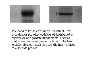 Polypepetides from cytoplasmic proteins or that are membrane-associated but extrinsic to a membrane tend to form well resolved narrow bands with sharp edges. Polypeptides that form intrinsic proteins bear sequences of hydrophobic side chains that may or may not denature completely. They often form bands that are broader with less distinct edges, indicating that the individual molecules ran as if they represented a distribution of molecular masses. Very large bands that are otherwise distinctly formed suggest either overloading of protein in a well or presence of a predominant polypeptide in a sample.
