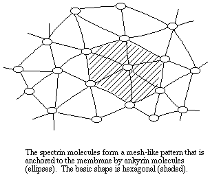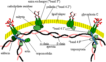 Organization of the Erythrocyte MembraneReference: Luna, EJ and AL Hitt, Cytoskeleton-plasma membrane interactions, Science 258: 955-964, 1991 The basic structure of the erythrocyte membrane cytoskeleton has been worked out, although some details remain obscure. Questions about the precise organization of the cytoskeleton and how it changes during deformation of the cell still remain. The genetic control of the multigene families of different cytoskeletal proteins remain to be worked out. Even when the last questions about the structure and function of the erythrocyte membrane are answered, the model will remain useful as a starting point in the study of other more complex cytoskeletal systems. Membrane-associated cytoskeletal protein networks are involved in the control of cell shape, attachments to other cells and to the substrate, and in organization of specialized membrane domains. Of current interest, for example, is the role of the membrane cytoskeleton in the organization of receptors and in the dynamics of receptor organization and reorganization under different conditions. Since details of the organization of the erythrocyte cytoskeleton are still to be worked out, the cartoon presented here must be considered only a working model. Details may change and may indeed be presented differently in textbooks and review articles that you happen across. The most prominent component of the red cell membrane cytoskeleton, by molecular mass at least, is a fibrous polypeptide called spectrin. Two isoforms of spectrin, alpha (260 kDa) and beta (225 kDa), form a loosely wound helix. Two alpha-beta helixes are linked end to end to form a single tetramer, which has binding sites for several other proteins, including other spectrin molecules. The spectrin tetramers are organized into a meshwork that is fixed to the membrane by the protein ankyrin (215 kDa). Ankyrin is itself connected to a transmembrane protein called 'band 3' or anion exchanger protein (90 to 100 kDa). The purpose of band 4.2 (palladin, 72 kDa) may be to stabilize the link between ankyrin and the anion exchanger (see the note on naming proteins by band number at the end of this document). Spectrin is also linked to a transmembrane protein called glycophorin C (25 kDa) by the protein known as 'band 4.1.' Thus the meshwork is anchored to the membrane at multiple sites.