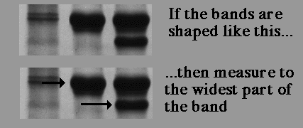 If the band is 'fat,' meaning there is too much protein, either find the same protein in a smaller quantity in another lane, re-do the gel with less protein, or estimate the relative mobility without doing another gel (my first choice, since the apparent MW is only an estimate anyway). Students often ask where to measure... middle of the band? Top of the band?