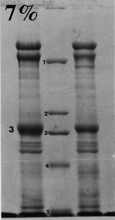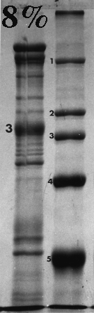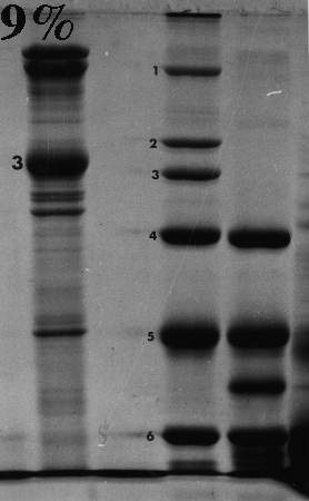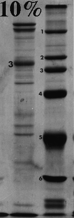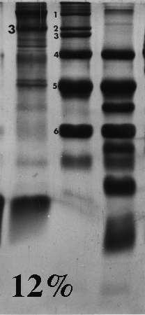 How gel concentration affects relative mobilityEach polyacrylamide gel effectively separates proteins over a specific and limited molecular weight range. There are two reasons for the limitations. First, the acrylamide concentration determines the cut-off at the low end. All polypeptides below a minimum molecular weight run at the same pace as the tracking dye. They do not separate from each other, and are therefore not resolved at all. Second, the relationship between mass and relative mobility is logarithmic. Resolution of individual bands tends to diminish toward the top of a gel, so that with the more dense gels multiple bands may appear to merge into a single band. Usually the top 10% or more of a gel is unusable.So what happens if you want to characterize all of the proteins in a sample? ...run more than one gel, of course! A gel with low density will resolve the larger polypeptides while cutting off the lighter ones, and one of higher density will reveal the smaller polypeptides, while compressing and possibly distorting the larger ones. Here are some examples of the effect of acrylamide concentration on relative mobility. Molecular weight standards are identified by number. A typical erythrocyte membrane protein sample is also presented, with band 3 protein labeled as a reference. Standard 1 = myosin (205,000); std. 2 = beta-galactosidase (116,000); std. 3 = phosphorylase B (92,000); std. 4 = bovine serum albumin (66,000); std. 5 = egg albumin (45,000); std. 6 = carbonic anhydrase (29,000). On the gels from 6 to 10% there is a distinct dark doublet at the top of the membrane lane. Notice in the 12% gel the doublet is jammed together and appears as one band. One could estimate MW of band 3 from the first five gels although the best estimate comes from the 6%, which produced the greatest separation between the standards on either side of band 3. The 12% gel did not resolve bands well at all above the fourth standard (serum albumin, 66,000). Analysis should be confined to the part of the gel below 66,000 or even lower if the same sample was run on a lower density gel. Frequently, students analyze the upper part of a high density acrylamide gel that overlaps part of a lower density gel. That practice suggests that the student missed the point of the anaysis and/or did not understand the limitations of the method. Interpret only that part of the denser gel that doesn't overlap the other one. To put it another way, use high density gels to study proteins (or parts of proteins) of relatively low molecular weight, and lower density gels to resolve proteins of higher molecular weight. Don't forget that different polypeptides can have similar or even identical molecular masses. One band on a gel can therefore consist of one or more polypeptides. This is most likely to happen toward the top of a gel, and especially in higher density gels. |