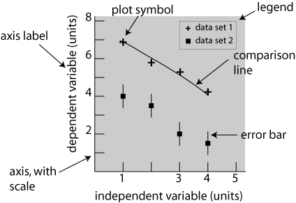 *Height, in cm To summarize, the purpose of a figure is to facilitate analysis and understanding of variable data, and convey that understanding to a reader. That will determine what you plot and how you plot it. Anatomy of a graphThere are many different types of plots, not all of which are used in technical presentations. The most common employs a symbol to plot each data value on an x-y coordinate plane. This is called a scatter plot, x-y plot, or line plot. Bar charts are also commonly used, particularly for histograms and when the independent variable is categorical. Examples of these types will be given below. Computer graphing packages also offer variants, such as “3D” bar charts and pie charts, but they are almost never used in a scientific context. The elements of a typical graph are shown in figure 1. The vertical (y) axis (the ordinate) always represents the dependent variable(s), while the horizontal (x) axis (the abscissa) always represents the independent variable. We describe the dependent variable(s) as plotted versus the independent variable. There are scale markings on the axes, either numbers for parametric variables or names for categorical variables. Both axes must have an axis label with the name of the variable and units, if applicable. The axes define the plot area, which is usually not enclosed on the other sides. A caption below the axis describes the content and, for a formal publication, identifies the figure by number. The data are represented with plot symbols or, sometimes, plotbars to make a bar graph. Plot symbols are sometimes identified with a legend in the plot area or, more commonly for technical work, in the caption.
