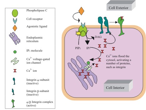 to the release of Ca2+ ions which are then sequestered by integrins.