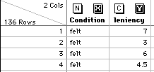 Choose Import from the file menu and select "Text/Others..." Then select the dataset. JMP will read in the data and name the variable Column 1 and Column 2. Edit the names by selecting the old names and typing new names. Column 1 is condition and Column 2 is leniency.