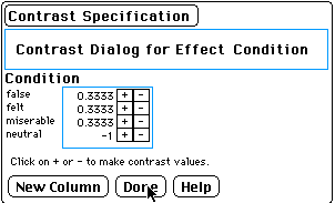 There will be quite a bit of output. On the right side of the output will be a label for "Condition." Click and hold down the arrow and choose "Add contrast."The dialog box shown below will appear at the lower right hand portion of the output. Click the plus sign for false, felt, miserable. Click the minus sign for neutral. Then click the "Done" button.