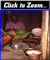 Yama and her daughters are our cooks. They prepare lunches and dinners. Yama's kitchen is in a small room downstairs from where we live. In the kitchen there are shelves along the wall and a "ji daga" (gee dah-gah) in the corner of the room. A "ji daga" is a large pot with a cover that is used to store water. The pot is made out of porous clay so that the water can slowly seep through the clay and keep the container cool. People need to store water in a cool place since there are no refrigerators. Also in the kitchen is a blackened ceramic cooker that sits over a live fire. The top is like a muffin pan and is used to cook little rice cakes. In the courtyard there is a wooden mortar and large pestle. This is used to pound rice and other grains into a flour-like consistency. This is necessary to make the rice cakes. There is also another fire in the kitchen. This fire is constructed inside a tripod arrangement of inverted large ceramic and metal pots. These support a large pot over the fire to cook the food. In order to cook, the women sit on tiny stools near the fire. Food is stirred and ladled out with scoops made out of gourds called calabashes. These look kind of like our butternut squashes as they are growing, but they are narrower at the top, and smaller. And when they are split and dried, they have a tough, wood-like texture that makes them useful as spoons. This is calabash season, and thousands of these calabash ladles are for sale in the market for 50 francs (10 cents) each. Yama stores her ladles in the wooden framework of the door, because there are no drawers or any kitchen counter.