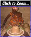 At the workshop (really, it was the front room of her house) the potter was seated on the floor with a large, shallow bowl between her legs. It was dark in the room, with only a small window and the door letting in light. Children crowded in the door to get a look at us. On this bowl, she placed a partially completed pot, to which she added a rope of clay to make a base on the pot to help it stand upright. She worked, smoothing the clay with one hand as she turned the big shallow bowl with the other. Oil placed on the ground under the big bowl helped it turn smoothly. If we visited a professional potter in the U.S., he or she would probably be using a potter's wheel, which goes around much faster. But the Jenné potter got a similar effect with a simpler technology. During the hour that we watched, she put bases on a half dozen pots that she had partially finished earlier in the day. She spit expertly into a corner every minute or so, observing Ramadan (the Islamic month of fasting during the day) by not even swallowing her own saliva! After putting the bases on, she showed us how she would apply an iron oxide pigment (hematite) that she had collected in the bush and ground to a fine powder. By mixing the pigment with water, she had a yellow paint that she could apply like a paint with a fur brush. I estimate that it must take her about two hours to make each of the small bowls she was producing in her personal assembly line. She sells them for 100 francs each (about 20 cents). In the U.S., she could probably get about 20 dollars for the same hand-crafted pot!